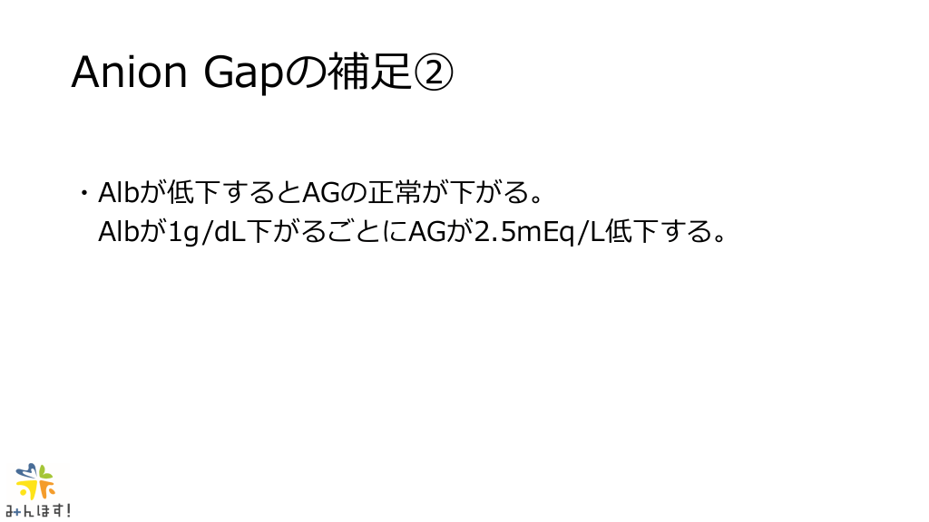 #54. Anion Gapの補足② ・Albが低下するとAGの正常が下がる。 Albが1g/dL下がるごとにAGが2.5mEq/L低下する。