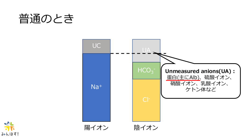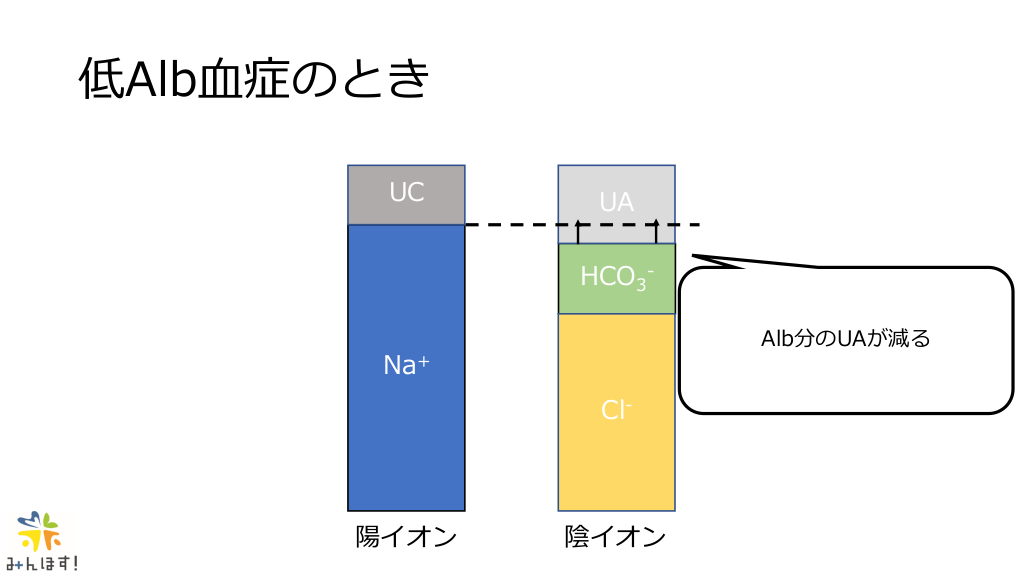 #56. 低Alb血症のとき UC UA HCO3Alb分のUAが減る Na+ Cl- 陽イオン 陰イオン