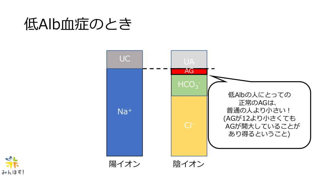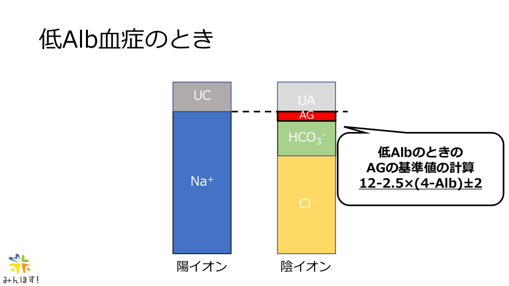 #58. 低Alb血症のとき UC UA AG HCO3Na+ Cl- 陽イオン 陰イオン 低Albのときの AGの基準値の計算 12-2.5×(4-Alb)±2