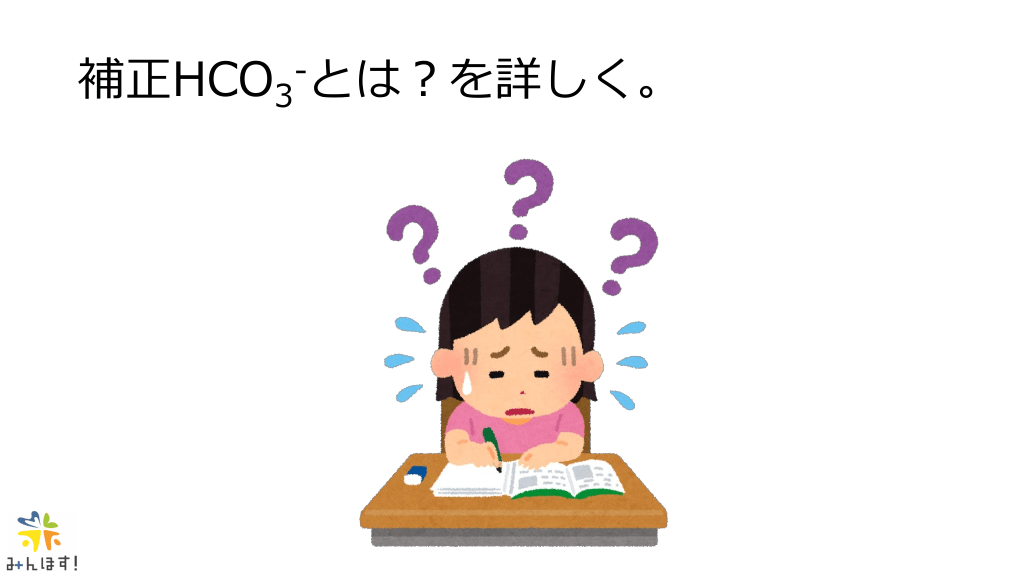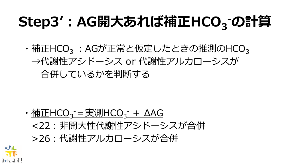 #60. Step3’:AG開大あれば補正HCO3-の計算 ・補正HCO3-:AGが正常と仮定したときの推測のHCO3→代謝性アシドーシス or 代謝性アルカローシスが 合併しているかを判断する ・補正HCO3-=実測HCO3- + ΔAG <22:非開大性代謝性アシドーシスが合併 >26:代謝性アルカローシスが合併