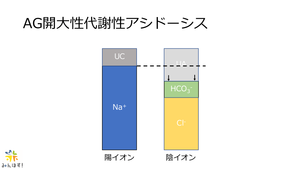 #63. AG開大性代謝性アシドーシス UC UA HCO3Na+ Cl- 陽イオン 陰イオン
