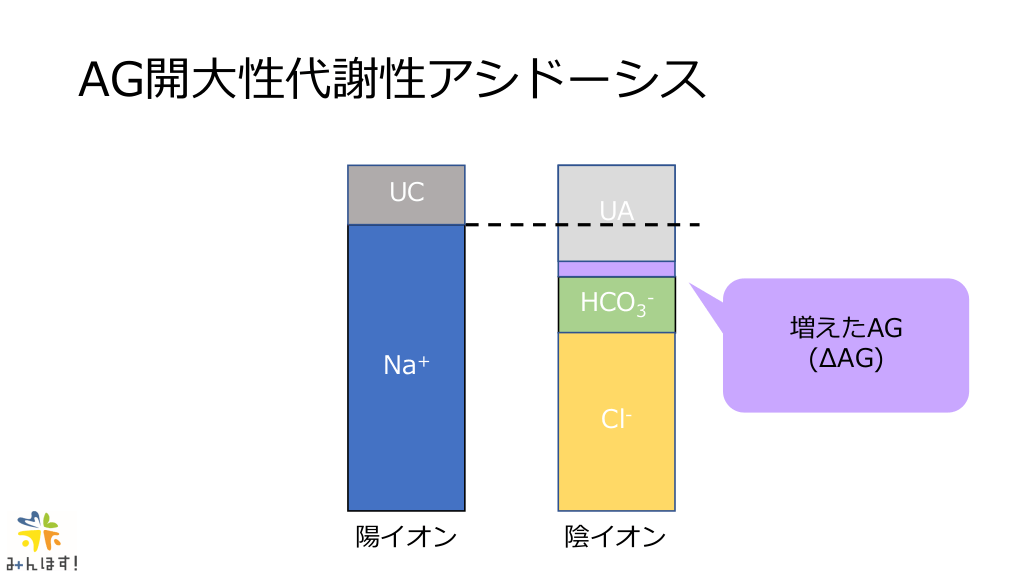 #64. AG開大性代謝性アシドーシス UC UA UA HCO3- Na+ Cl- 陽イオン 陰イオン 増えたAG (ΔAG)