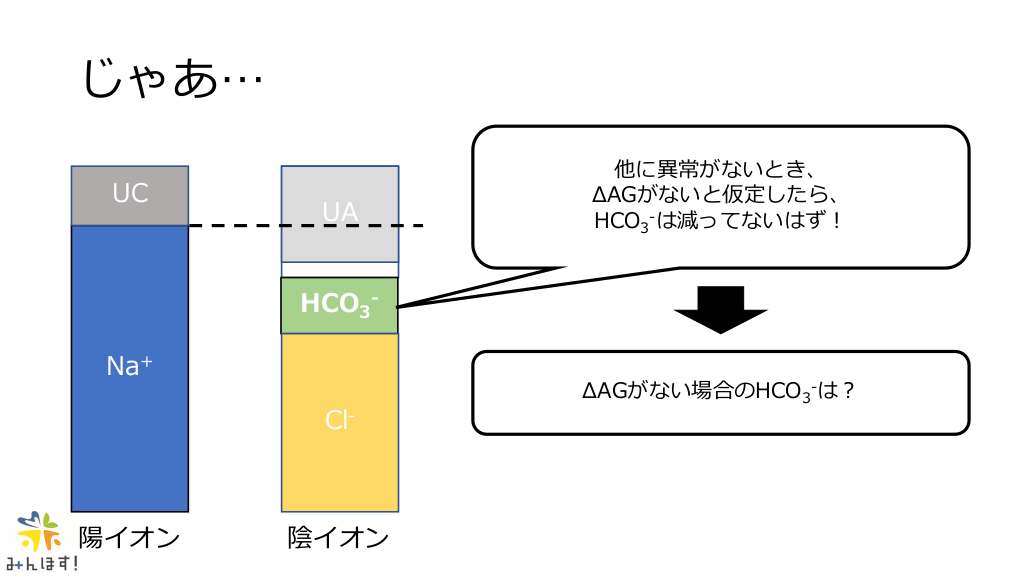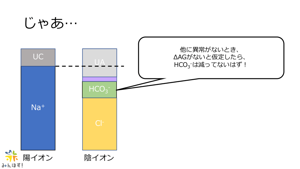#65. じゃあ… UC UA UA HCO3- Na+ Cl- 陽イオン 陰イオン 他に異常がないとき、 ΔAGがないと仮定したら、 HCO3-は減ってないはず!