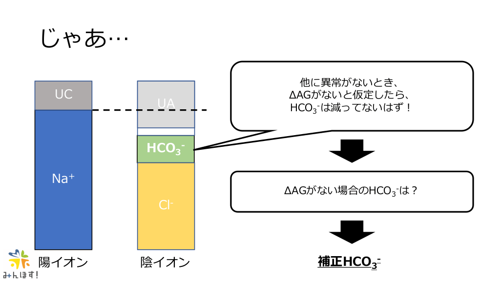 #67. じゃあ… UC UA UA 他に異常がないとき、 ΔAGがないと仮定したら、 HCO3-は減ってないはず! HCO3- Na+ Cl- 陽イオン 陰イオン ΔAGがない場合のHCO3-は? 補正HCO3-