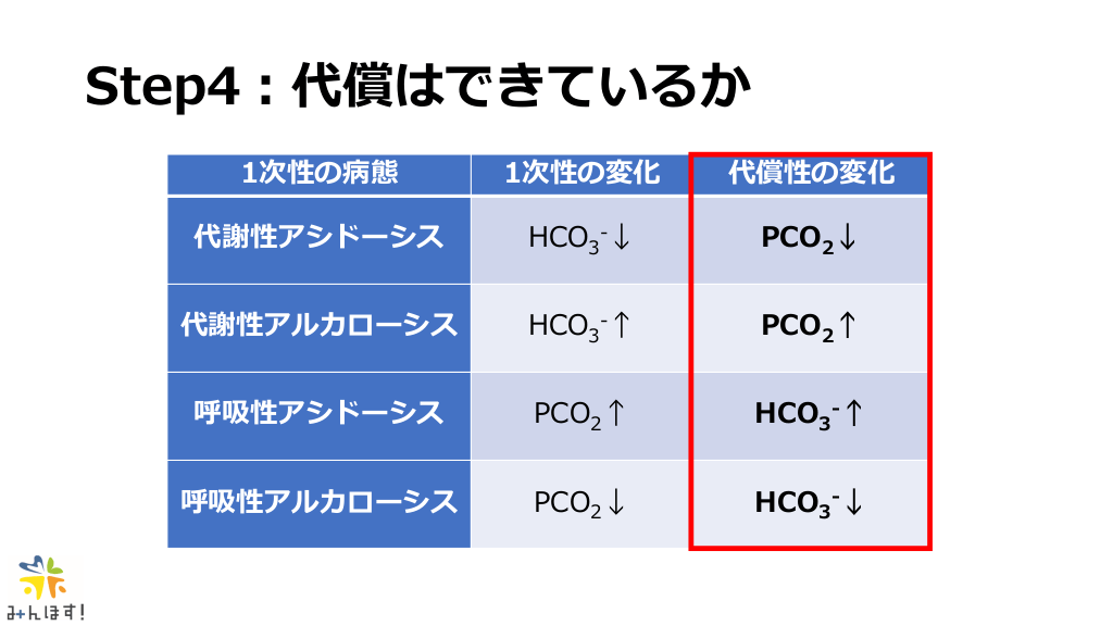 #69. Step4:代償はできているか 1次性の病態 1次性の変化 代償性の変化 代謝性アシドーシス HCO3-↓ PCO2↓ 代謝性アルカローシス HCO3-↑ PCO2↑ 呼吸性アシドーシス PCO2↑ HCO3-↑ 呼吸性アルカローシス PCO2↓ HCO3-↓