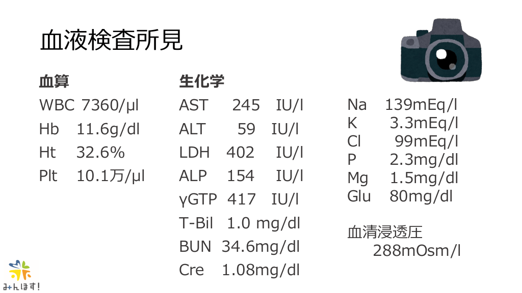#78. 血液検査所見 血算 生化学 WBC 7360/μl AST 245 IU/l Hb 11.6g/dl ALT 59 IU/l Ht 32.6% LDH 402 IU/l Plt 10.1万/μl ALP 154 IU/l γGTP 417 IU/l T-Bil 1.0 mg/dl BUN 34.6mg/dl Cre 1.08mg/dl Na 139mEq/l K 3.3mEq/l Cl 99mEq/l P 2.3mg/dl Mg 1.5mg/dl Glu 80mg/dl 血清浸透圧 288mOsm/l