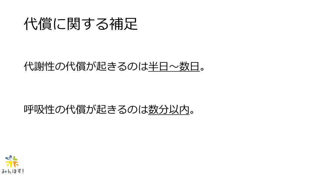 #71. 代償に関する補足 代謝性の代償が起きるのは半日~数日。 呼吸性の代償が起きるのは数分以内。