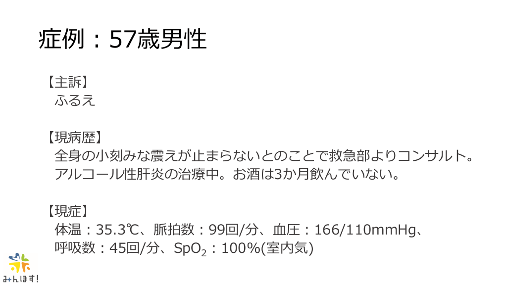 #6. 症例:57歳男性 【主訴】 ふるえ 【現病歴】 全身の小刻みな震えが止まらないとのことで救急部よりコンサルト。 アルコール性肝炎の治療中。お酒は3か月飲んでいない。 【現症】 体温:35.3℃、脈拍数:99回/分、血圧:166/110mmHg、 呼吸数:45回/分、SpO2:100%(室内気)