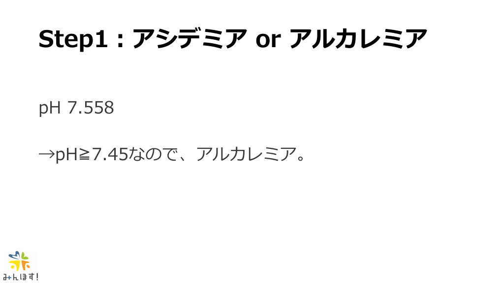 #82. Step1:アシデミア or アルカレミア pH 7.558 →pH≧7.45なので、アルカレミア。