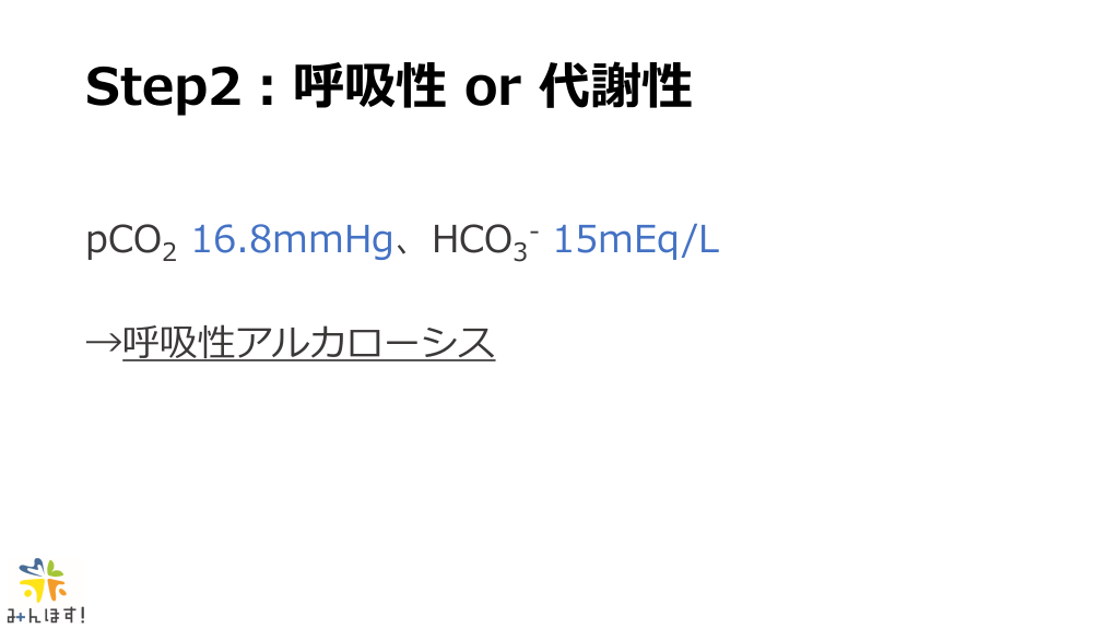#83. Step2:呼吸性 or 代謝性 pCO2 16.8mmHg、HCO3- 15mEq/L →呼吸性アルカローシス