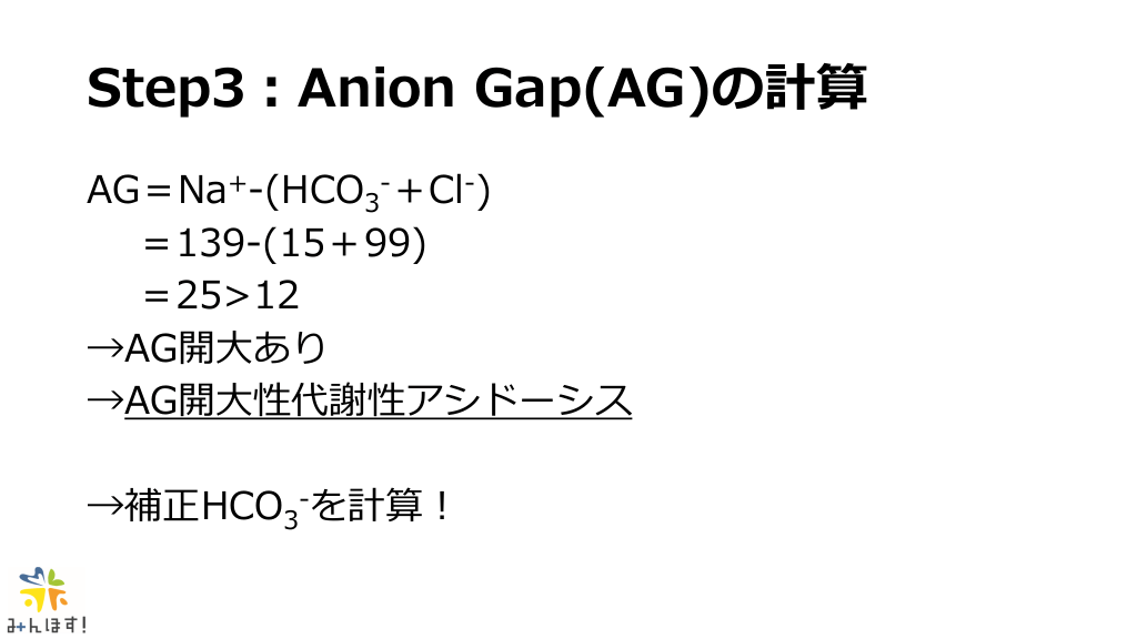 #84. Step3:Anion Gap(AG)の計算 AG=Na+-(HCO3-+Cl-) =139-(15+99) =25>12 →AG開大あり →AG開大性代謝性アシドーシス →補正HCO3-を計算!
