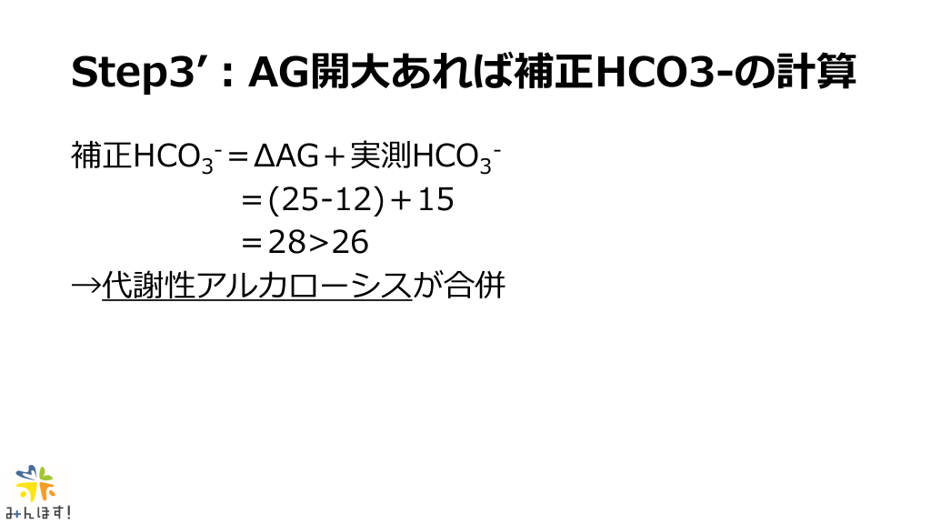 #85. Step3’:AG開大あれば補正HCO3-の計算 補正HCO3-=ΔAG+実測HCO3=(25-12)+15 =28>26 →代謝性アルカローシスが合併