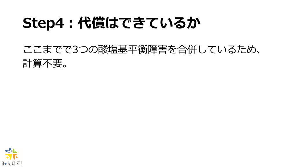 #86. Step4:代償はできているか ここまでで3つの酸塩基平衡障害を合併しているため、 計算不要。
