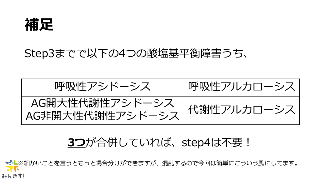 #87. 補足 Step3までで以下の4つの酸塩基平衡障害うち、 呼吸性アシドーシス 呼吸性アルカローシス AG開大性代謝性アシドーシス 代謝性アルカローシス AG非開大性代謝性アシドーシス 3つが合併していれば、step4は不要! ※細かいことを言うともっと場合分けができますが、混乱するので今回は簡単にこういう風にしてます。
