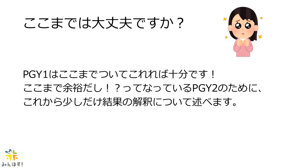 #90. ここまでは大丈夫ですか? PGY1はここまでついてこれれば十分です! ここまで余裕だし!?ってなっているPGY2のために、 これから少しだけ結果の解釈について述べます。