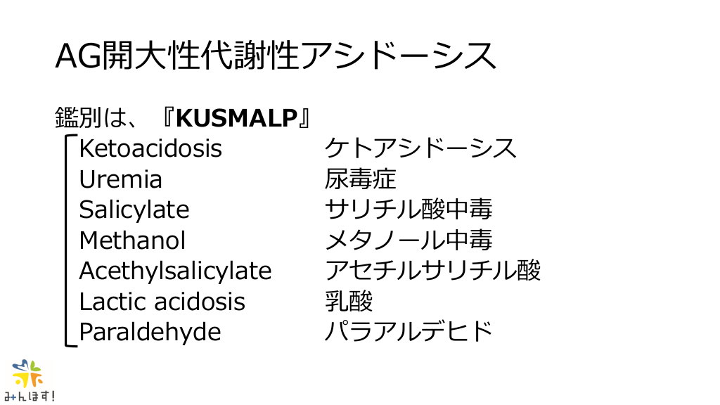 #93. AG開大性代謝性アシドーシス 鑑別は、『KUSMALP』 Ketoacidosis ケトアシドーシス Uremia 尿毒症 Salicylate サリチル酸中毒 Methanol メタノール中毒 Acethylsalicylate アセチルサリチル酸 Lactic acidosis 乳酸 Paraldehyde パラアルデヒド