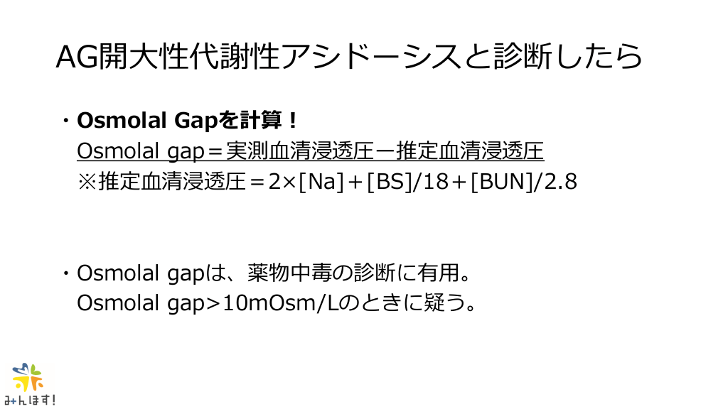 #95. AG開大性代謝性アシドーシスと診断したら ・Osmolal Gapを計算! Osmolal gap=実測血清浸透圧ー推定血清浸透圧 ※推定血清浸透圧=2×[Na]+[BS]/18+[BUN]/2.8 ・Osmolal gapは、薬物中毒の診断に有用。 Osmolal gap>10mOsm/Lのときに疑う。