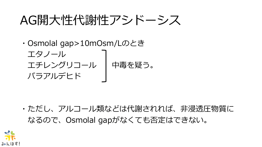 #96. AG開大性代謝性アシドーシス ・Osmolal gap>10mOsm/Lのとき エタノール エチレングリコール 中毒を疑う。 パラアルデヒド ・ただし、アルコール類などは代謝されれば、非浸透圧物質に なるので、Osmolal gapがなくても否定はできない。