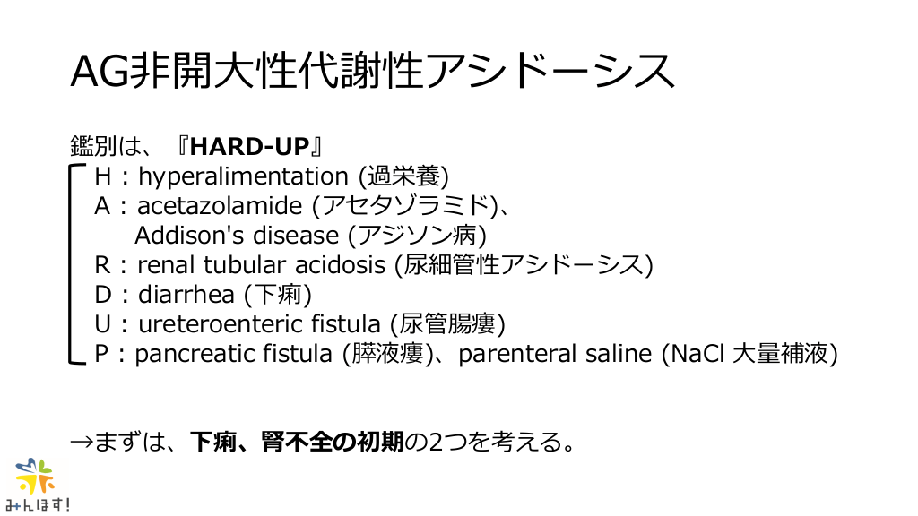 #99. AG非開大性代謝性アシドーシス 鑑別は、『HARD‐UP』 H : hyperalimentation (過栄養) A : acetazolamide (アセタゾラミド)、 Addison's disease (アジソン病) R : renal tubular acidosis (尿細管性アシドーシス) D : diarrhea (下痢) U : ureteroenteric fistula (尿管腸瘻) P : pancreatic fistula (膵液瘻)、parenteral saline (NaCl 大量補液) →まずは、下痢、腎不全の初期の2つを考える。