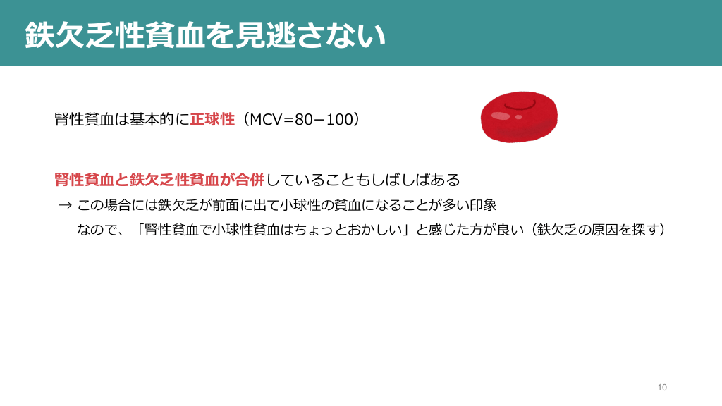 #10. 鉄⽋乏性貧⾎を⾒逃さない 腎性貧⾎は基本的に正球性(MCV=80100) 腎性貧⾎と鉄⽋乏性貧⾎が合併していることもしばしばある → この場合には鉄⽋乏が前⾯に出て⼩球性の貧⾎になることが多い印象 なので、「腎性貧⾎で⼩球性貧⾎はちょっとおかしい」と感じた⽅が良い(鉄⽋乏の原因を探す) 10