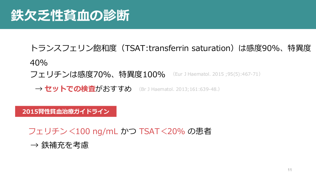 #11. 鉄⽋乏性貧⾎の診断 トランスフェリン飽和度(TSAT:transferrin saturation)は感度90%、特異度 40% フェリチンは感度70%、特異度100% → セットでの検査がおすすめ (Eur J Haematol. 2015 ;95(5):467-71) (Br J Haematol. 2013;161:639-48.) 2015腎性貧⾎治療ガイドライン フェリチン<100 ng/mL かつ TSAT<20% の患者 → 鉄補充を考慮 11