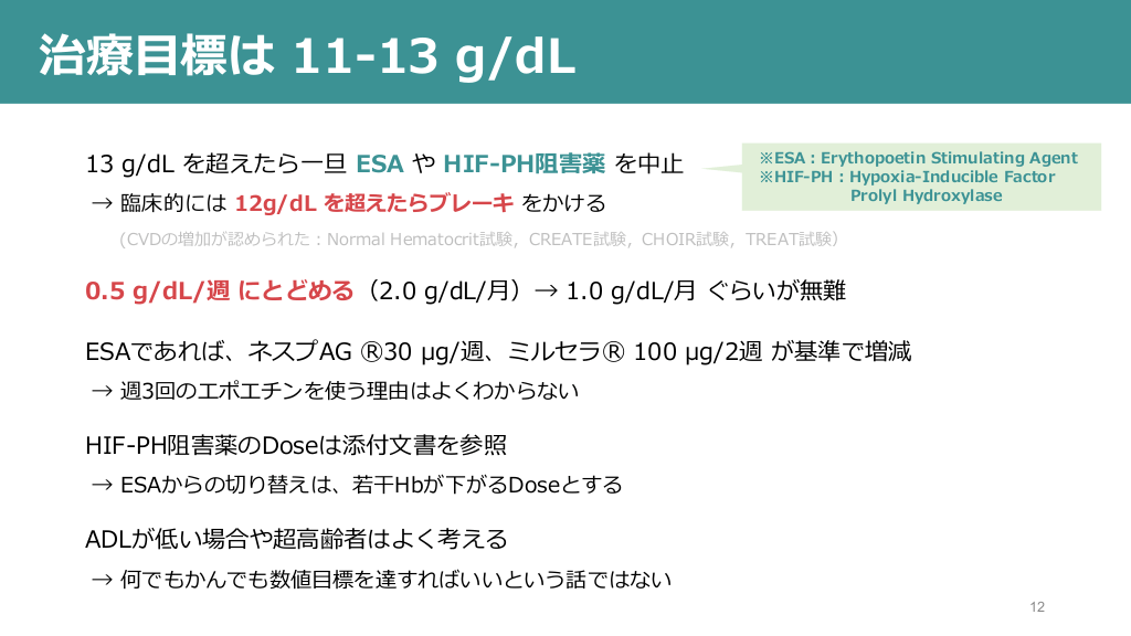 #12. 治療⽬標は 11-13 g/dL 13 g/dL を超えたら⼀旦 ESA や HIF-PH阻害薬 を中⽌ → 臨床的には 12g/dL を超えたらブレーキ をかける ※ESA︓Erythopoetin Stimulating Agent ※HIF-PH︓Hypoxia-Inducible Factor Prolyl Hydroxylase (CVDの増加が認められた︓Normal Hematocrit試験,CREATE試験,CHOIR試験,TREAT試験) 0.5 g/dL/週 にとどめる(2.0 g/dL/⽉)→ 1.0 g/dL/⽉ ぐらいが無難 ESAであれば、ネスプAG Ⓡ30 μg/週、ミルセラⓇ 100 μg/2週 が基準で増減 → 週3回のエポエチンを使う理由はよくわからない HIF-PH阻害薬のDoseは添付⽂書を参照 → ESAからの切り替えは、若⼲Hbが下がるDoseとする ADLが低い場合や超⾼齢者はよく考える → 何でもかんでも数値⽬標を達すればいいという話ではない 12
