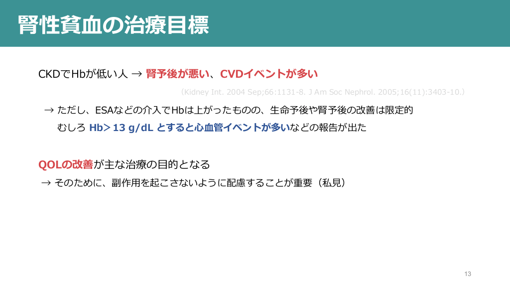 #13. 腎性貧⾎の治療⽬標 CKDでHbが低い⼈ → 腎予後が悪い、CVDイベントが多い (Kidney Int. 2004 Sep;66:1131-8. J Am Soc Nephrol. 2005;16(11):3403-10.) → ただし、ESAなどの介⼊でHbは上がったものの、⽣命予後や腎予後の改善は限定的 むしろ Hb>13 g/dL とすると⼼⾎管イベントが多いなどの報告が出た QOLの改善が主な治療の⽬的となる → そのために、副作⽤を起こさないように配慮することが重要(私⾒) 13