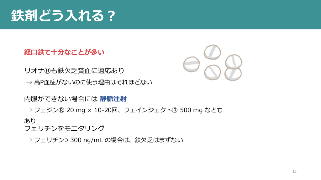 #14. 鉄剤どう⼊れる︖ 経⼝鉄で⼗分なことが多い リオナⓇも鉄⽋乏貧⾎に適応あり → ⾼P⾎症がないのに使う理由はそれほどない 内服ができない場合には 静脈注射 → フェジンⓇ 20 mg × 10-20回、フェインジェクトⓇ 500 mg なども あり フェリチンをモニタリング → フェリチン>300 ng/mL の場合は、鉄⽋乏はまずない 14