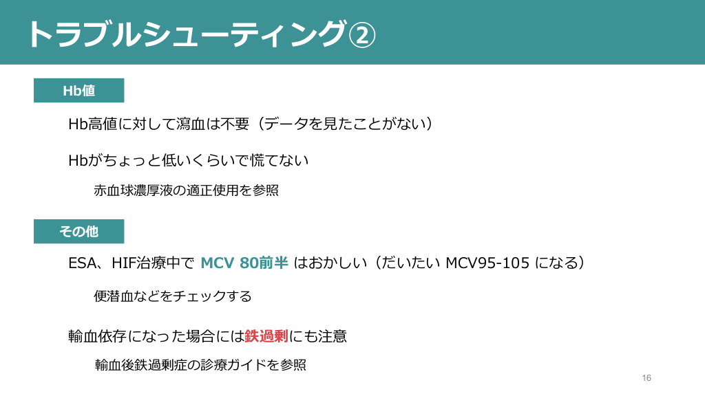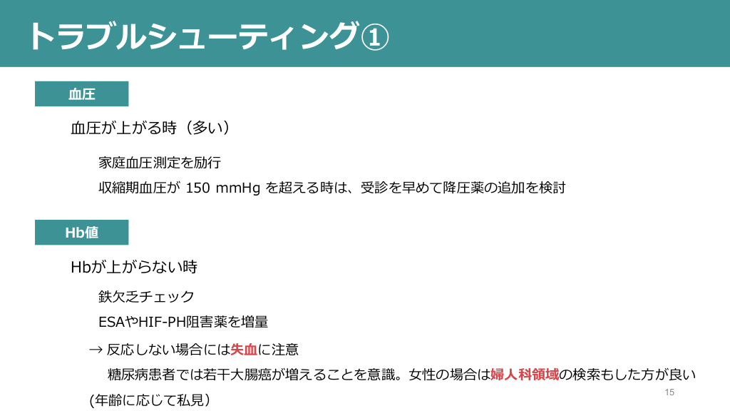 #15. トラブルシューティング① ⾎圧 ⾎圧が上がる時(多い) 家庭⾎圧測定を励⾏ 収縮期⾎圧が 150 mmHg を超える時は、受診を早めて降圧薬の追加を検討 Hb値 Hbが上がらない時 鉄⽋乏チェック ESAやHIF-PH阻害薬を増量 → 反応しない場合には失⾎に注意 糖尿病患者では若⼲⼤腸癌が増えることを意識。⼥性の場合は婦⼈科領域の検索もした⽅が良い (年齢に応じて私⾒) 15