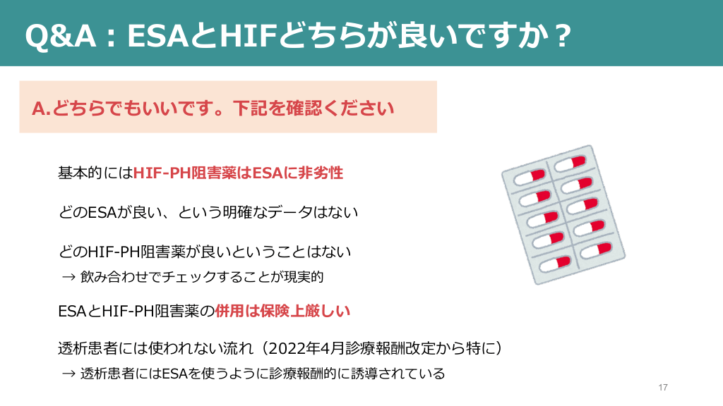 #17. Q&A︓ESAとHIFどちらが良いですか︖ A.どちらでもいいです。下記を確認ください 基本的にはHIF-PH阻害薬はESAに⾮劣性 どのESAが良い、という明確なデータはない どのHIF-PH阻害薬が良いということはない → 飲み合わせでチェックすることが現実的 ESAとHIF-PH阻害薬の併⽤は保険上厳しい 透析患者には使われない流れ(2022年4⽉診療報酬改定から特に) → 透析患者にはESAを使うように診療報酬的に誘導されている 17