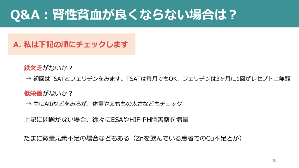 #18. Q&A︓腎性貧⾎が良くならない場合は︖ A. 私は下記の順にチェックします 鉄⽋乏がないか︖ → 初回はTSATとフェリチンをみます。TSATは毎⽉でもOK、フェリチンは3ヶ⽉に1回がレセプト上無難 低栄養がないか︖ → 主にAlbなどをみるが、体重や太ももの太さなどもチェック 上記に問題がない場合、徐々にESAやHIF-PH阻害薬を増量 たまに微量元素不⾜の場合などもある(Znを飲んでいる患者でのCu不⾜とか) 18