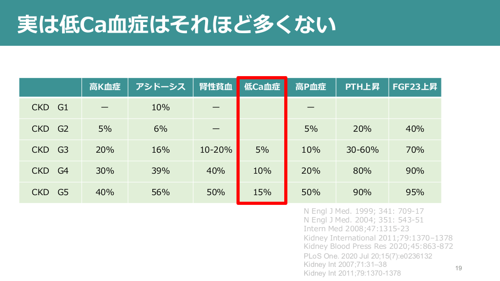 #19. 実は低Ca⾎症はそれほど多くない ⾼K⾎症 アシドーシス 腎性貧⾎ 低Ca⾎症 ⾼P⾎症 PTH上昇 FGF23上昇 CKD G1 ー 10% ー ー CKD G2 5% 6% ー 5% 20% 40% CKD G3 20% 16% 10-20% 5% 10% 30-60% 70% CKD G4 30% 39% 40% 10% 20% 80% 90% CKD G5 40% 56% 50% 15% 50% 90% 95% N Engl J Med. 1999; 341: 709-17 N Engl J Med. 2004; 351: 543-51 Intern Med 2008;47:1315-23 Kidney International 2011;79:1370–1378 Kidney Blood Press Res 2020;45:863-872 PLoS One. 2020 Jul 20;15(7):e0236132 Kidney Int 2007;71:31–38 19 Kidney Int 2011;79:1370-1378