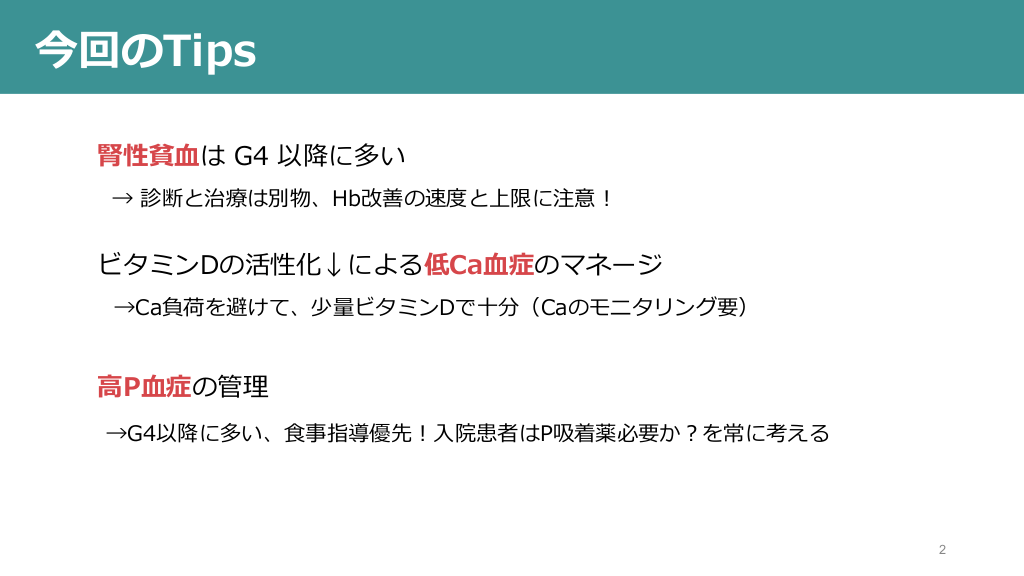 #2. 今回のTips 腎性貧⾎は G4 以降に多い → 診断と治療は別物、Hb改善の速度と上限に注意︕ ビタミンDの活性化↓による低Ca⾎症のマネージ →Ca負荷を避けて、少量ビタミンDで⼗分(Caのモニタリング要) ⾼P⾎症の管理 →G4以降に多い、⾷事指導優先︕⼊院患者はP吸着薬必要か︖を常に考える 2