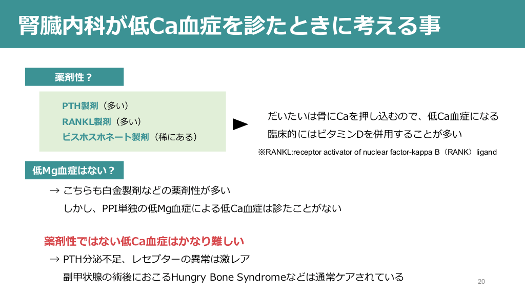 #20. 腎臓内科が低Ca⾎症を診たときに考える事 薬剤性︖ PTH製剤(多い) RANKL製剤(多い) ビスホスホネート製剤(稀にある) だいたいは⾻にCaを押し込むので、低Ca⾎症になる 臨床的にはビタミンDを併⽤することが多い ※RANKL:receptor activator of nuclear factor-kappa B(RANK)ligand 低Mg⾎症はない︖ → こちらも⽩⾦製剤などの薬剤性が多い しかし、PPI単独の低Mg⾎症による低Ca⾎症は診たことがない 薬剤性ではない低Ca⾎症はかなり難しい → PTH分泌不⾜、レセプターの異常は激レア 副甲状腺の術後におこるHungry Bone Syndromeなどは通常ケアされている 20