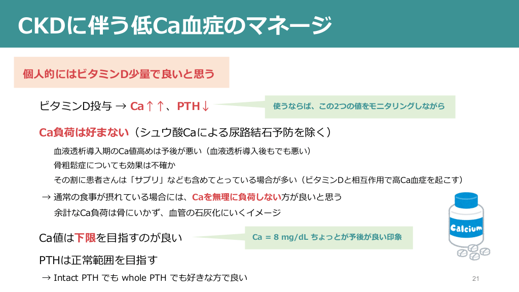 #21. CKDに伴う低Ca⾎症のマネージ 個⼈的にはビタミンD少量で良いと思う ビタミンD投与 → Ca↑↑、PTH↓ 使うならば、この2つの値をモニタリングしながら Ca負荷は好まない(シュウ酸Caによる尿路結⽯予防を除く) ⾎液透析導⼊期のCa値⾼めは予後が悪い(⾎液透析導⼊後もでも悪い) ⾻粗鬆症についても効果は不確か その割に患者さんは「サプリ」なども含めてとっている場合が多い(ビタミンDと相互作⽤で⾼Ca⾎症を起こす) → 通常の⾷事が摂れている場合には、Caを無理に負荷しない⽅が良いと思う 余計なCa負荷は⾻にいかず、⾎管の⽯灰化にいくイメージ Ca値は下限を⽬指すのが良い Ca = 8 mg/dL ちょっとが予後が良い印象 PTHは正常範囲を⽬指す → Intact PTH でも whole PTH でも好きな⽅で良い 21
