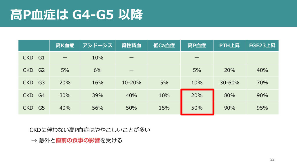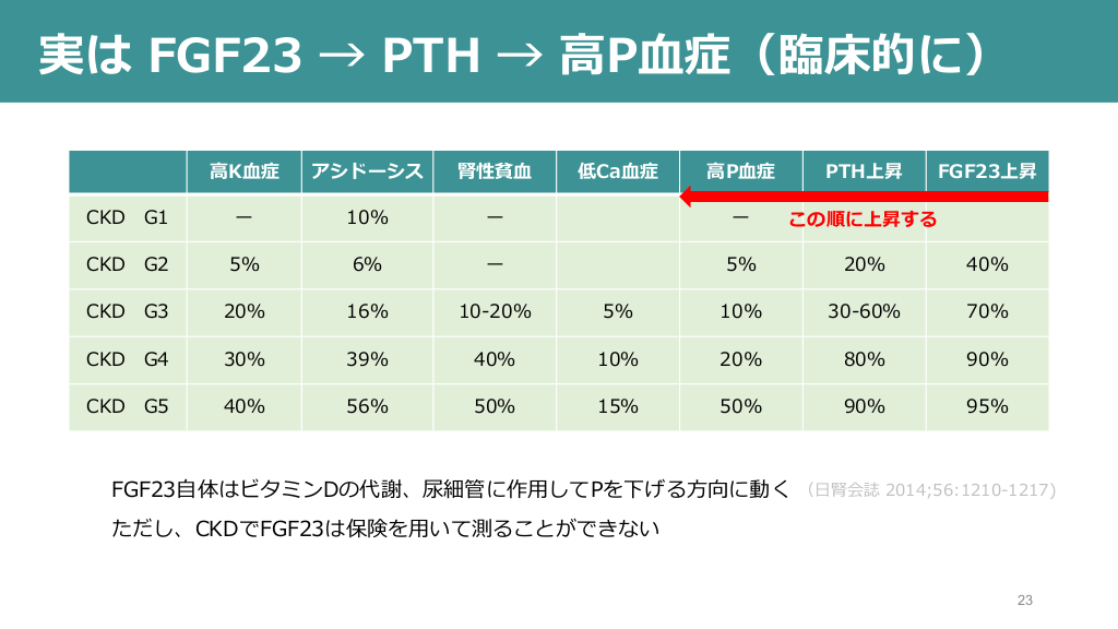 #22. ⾼P⾎症は G4-G5 以降 ⾼K⾎症 アシドーシス 腎性貧⾎ 低Ca⾎症 ⾼P⾎症 PTH上昇 FGF23上昇 CKD G1 ー 10% ー ー CKD G2 5% 6% ー 5% 20% 40% CKD G3 20% 16% 10-20% 5% 10% 30-60% 70% CKD G4 30% 39% 40% 10% 20% 80% 90% CKD G5 40% 56% 50% 15% 50% 90% 95% CKDに伴わない⾼P⾎症はややこしいことが多い → 意外と直前の⾷事の影響を受ける 22
