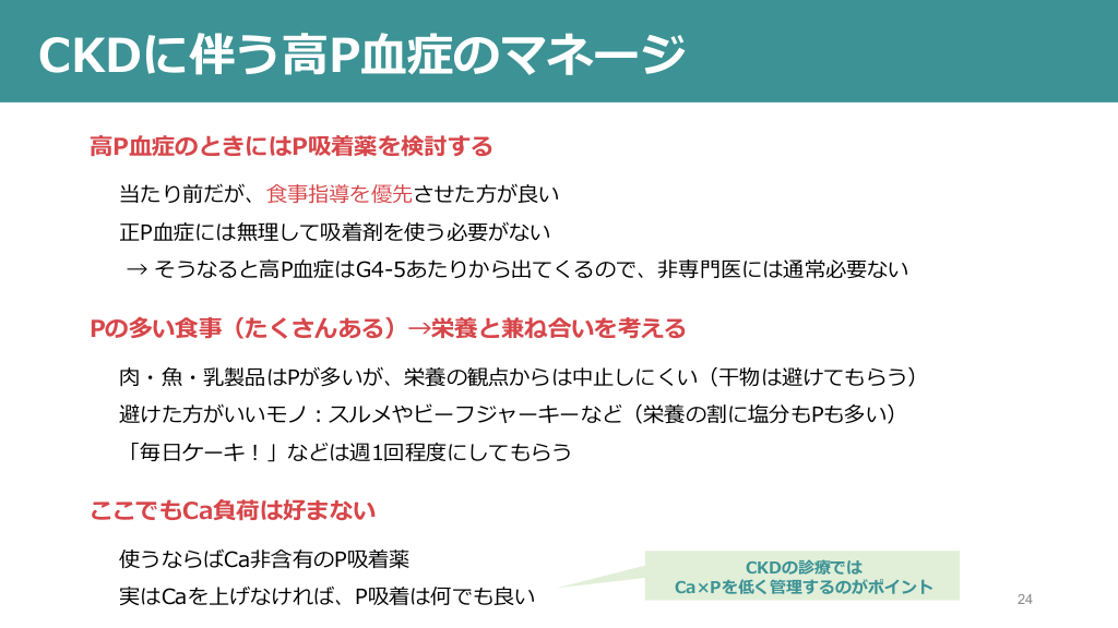 #24. CKDに伴う⾼P⾎症のマネージ ⾼P⾎症のときにはP吸着薬を検討する 当たり前だが、⾷事指導を優先させた⽅が良い 正P⾎症には無理して吸着剤を使う必要がない → そうなると⾼P⾎症はG4-5あたりから出てくるので、⾮専⾨医には通常必要ない Pの多い⾷事(たくさんある)→栄養と兼ね合いを考える ⾁・⿂・乳製品はPが多いが、栄養の観点からは中⽌しにくい(⼲物は避けてもらう) 避けた⽅がいいモノ︓スルメやビーフジャーキーなど(栄養の割に塩分もPも多い) 「毎⽇ケーキ︕」などは週1回程度にしてもらう ここでもCa負荷は好まない 使うならばCa⾮含有のP吸着薬 実はCaを上げなければ、P吸着は何でも良い CKDの診療では Ca×Pを低く管理するのがポイント 24