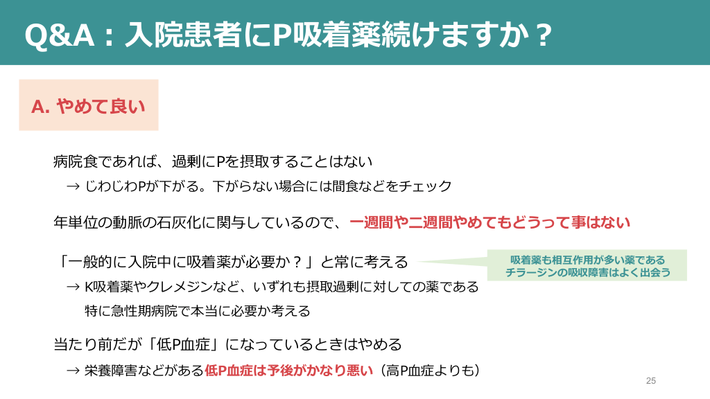 #25. Q&A︓⼊院患者にP吸着薬続けますか︖ A. やめて良い 病院⾷であれば、過剰にPを摂取することはない → じわじわPが下がる。下がらない場合には間⾷などをチェック 年単位の動脈の⽯灰化に関与しているので、⼀週間や⼆週間やめてもどうって事はない 「⼀般的に⼊院中に吸着薬が必要か︖」と常に考える → K吸着薬やクレメジンなど、いずれも摂取過剰に対しての薬である 吸着薬も相互作⽤が多い薬である チラージンの吸収障害はよく出会う 特に急性期病院で本当に必要か考える 当たり前だが「低P⾎症」になっているときはやめる → 栄養障害などがある低P⾎症は予後がかなり悪い(⾼P⾎症よりも) 25