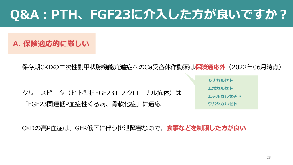 #26. Q&A︓PTH、FGF23に介⼊した⽅が良いですか︖ A. 保険適応的に厳しい 保存期CKDの⼆次性副甲状腺機能亢進症へのCa受容体作動薬は保険適応外(2022年06⽉時点) シナカルセト クリースビータ(ヒト型抗FGF23モノクローナル抗体)は 「FGF23関連低P⾎症性くる病、⾻軟化症」に適応 エボカルセト エテルカルセチド ウパシカルセト CKDの⾼P⾎症は、GFR低下に伴う排泄障害なので、⾷事などを制限した⽅が良い 26