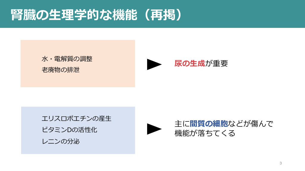 #3. 腎臓の⽣理学的な機能(再掲) ⽔・電解質の調整 ⽼廃物の排泄 エリスロポエチンの産⽣ ビタミンDの活性化 レニンの分泌 尿の⽣成が重要 主に間質の細胞などが傷んで 機能が落ちてくる 3