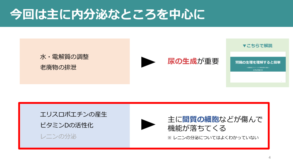 #4. 今回は主に内分泌なところを中⼼に ▼こちらで解説 ⽔・電解質の調整 ⽼廃物の排泄 エリスロポエチンの産⽣ ビタミンDの活性化 レニンの分泌 尿の⽣成が重要 主に間質の細胞などが傷んで 機能が落ちてくる ※ レニンの分泌についてはよくわかっていない 4