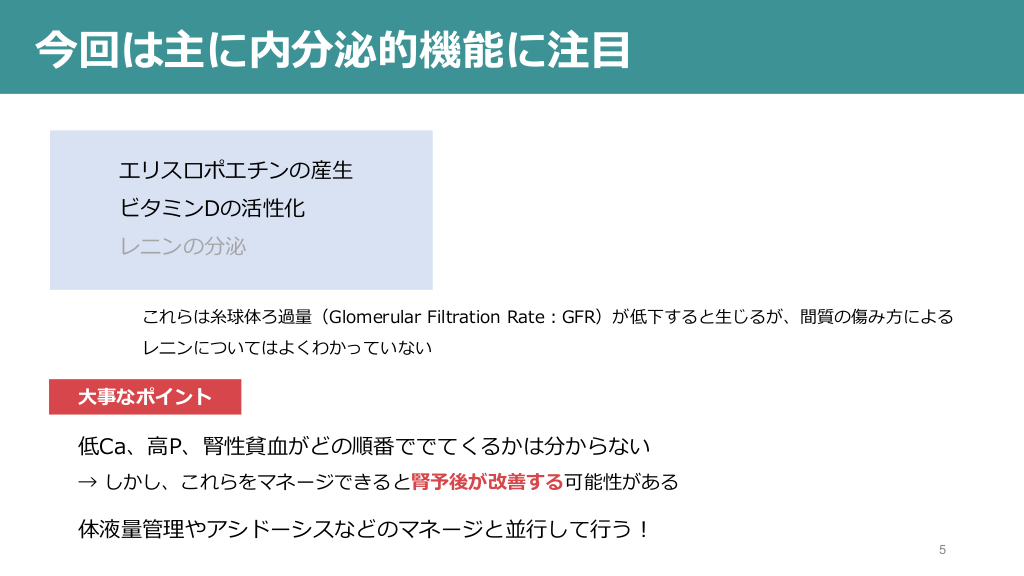 #5. 今回は主に内分泌的機能に注⽬ エリスロポエチンの産⽣ ビタミンDの活性化 レニンの分泌 これらは⽷球体ろ過量(Glomerular Filtration Rate︓GFR)が低下すると⽣じるが、間質の傷み⽅による レニンについてはよくわかっていない ⼤事なポイント 低Ca、⾼P、腎性貧⾎がどの順番ででてくるかは分からない → しかし、これらをマネージできると腎予後が改善する可能性がある 体液量管理やアシドーシスなどのマネージと並⾏して⾏う︕ 5