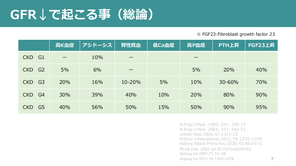 #6. GFR↓で起こる事(総論) ※ FGF23:Fibroblast growth factor 23 ⾼K⾎症 アシドーシス 腎性貧⾎ 低Ca⾎症 ⾼P⾎症 PTH上昇 FGF23上昇 CKD G1 ー 10% ー ー CKD G2 5% 6% ー 5% 20% 40% CKD G3 20% 16% 10-20% 5% 10% 30-60% 70% CKD G4 30% 39% 40% 10% 20% 80% 90% CKD G5 40% 56% 50% 15% 50% 90% 95% N Engl J Med. 1999; 341: 709-17 N Engl J Med. 2004; 351: 543-51 Intern Med 2008;47:1315-23 Kidney International 2011;79:1370–1378 Kidney Blood Press Res 2020;45:863-872 PLoS One. 2020 Jul 20;15(7):e0236132 Kidney Int 2007;71:31–38 Kidney Int 2011;79:1370-1378 6