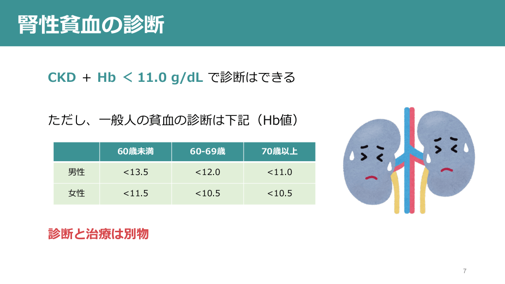 #7. 腎性貧⾎の診断 CKD + Hb < 11.0 g/dL で診断はできる ただし、⼀般⼈の貧⾎の診断は下記(Hb値) 60歳未満 60-69歳 70歳以上 男性 <13.5 <12.0 <11.0 ⼥性 <11.5 <10.5 <10.5 診断と治療は別物 7