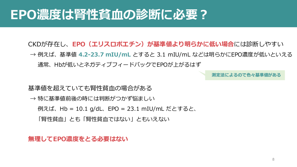 #8. EPO濃度は腎性貧⾎の診断に必要︖ CKDが存在し、EPO(エリスロポエチン)が基準値より明らかに低い場合には診断しやすい → 例えば、基準値 4.2-23.7 mIU/mL とすると 3.1 mIU/mL などは明らかにEPO濃度が低いといえる 通常、Hbが低いとネガティブフィードバックでEPOが上がるはず 測定法によるので⾊々基準値がある 基準値を超えていても腎性貧⾎の場合がある → 特に基準値前後の時には判断がつかず悩ましい 例えば、Hb = 10.1 g/dL、EPO = 23.1 mIU/mL だとすると、 「腎性貧⾎」とも「腎性貧⾎ではない」ともいえない 無理してEPO濃度をとる必要はない 8
