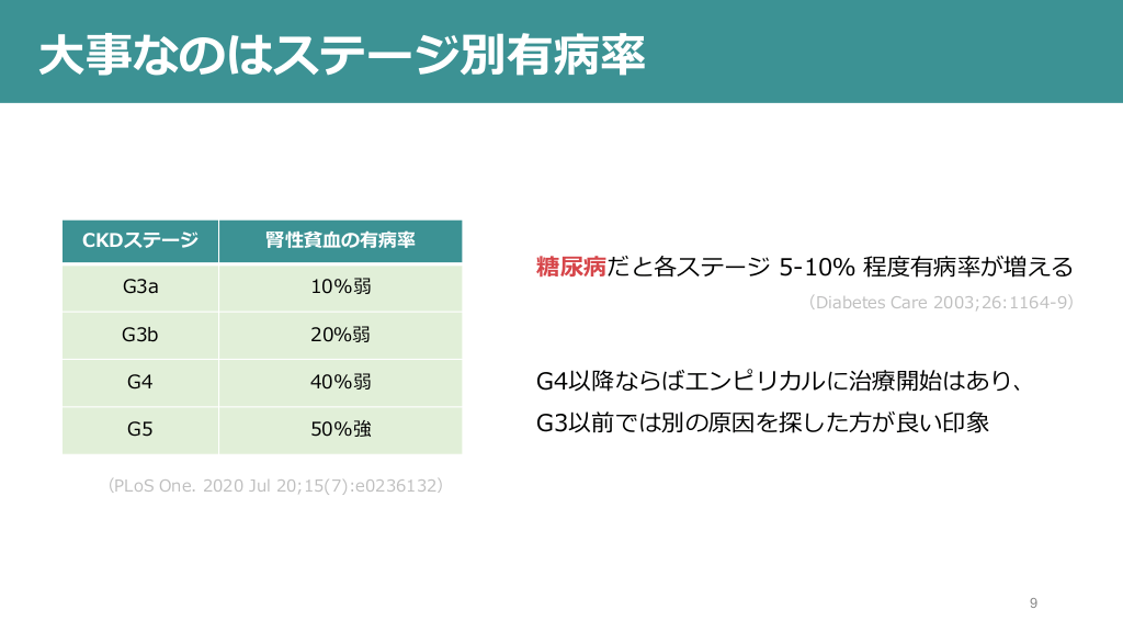 #9. ⼤事なのはステージ別有病率 CKDステージ 腎性貧⾎の有病率 G3a 10%弱 G3b 20%弱 G4 40%弱 G4以降ならばエンピリカルに治療開始はあり、 G5 50%強 G3以前では別の原因を探した⽅が良い印象 糖尿病だと各ステージ 5-10% 程度有病率が増える (Diabetes Care 2003;26:1164-9) (PLoS One. 2020 Jul 20;15(7):e0236132) 9