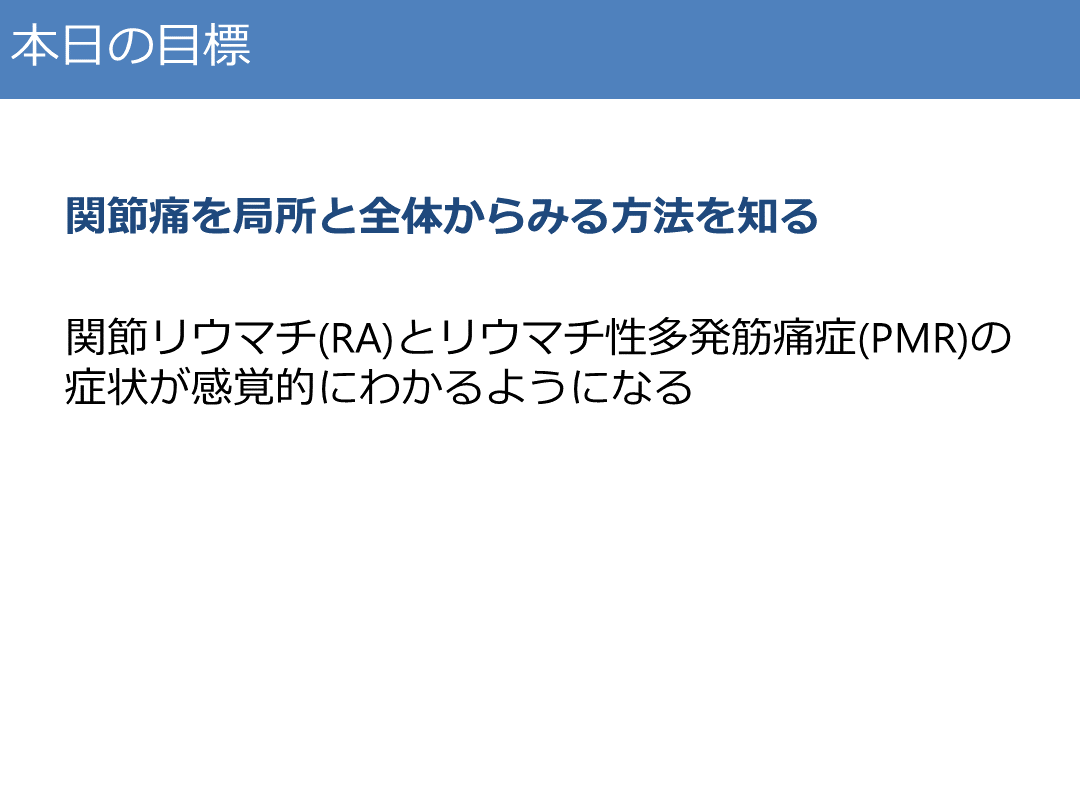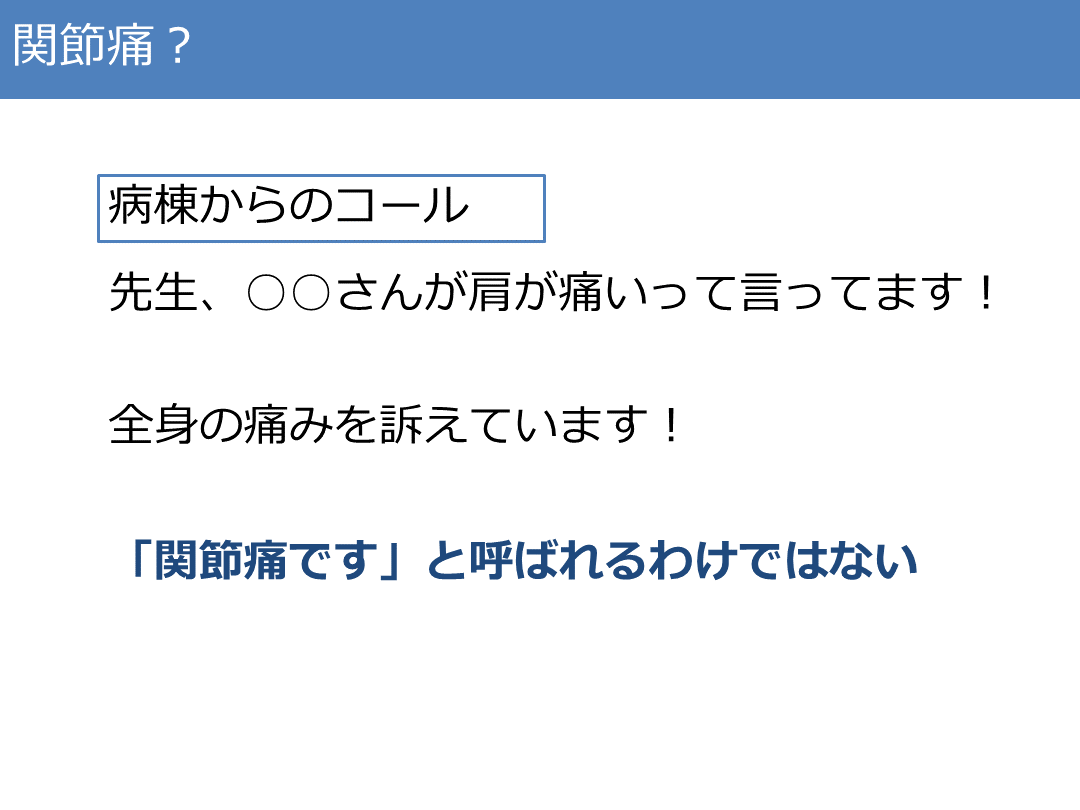 リウマチ科からみた関節痛の見方を診察法、検査、鑑別診断に分けて解説。非外傷性肩痛をきたす疾患の頻度、解剖と鑑別疾患、painful arcなどの診察法血液検査について説明。関節炎と非炎症性関節痛・関節外症状のフレームワーク、診察セット。最後に関節リウマチ(RA)とリウマチ性多発筋痛症(PMR)の診断基準、典型例について説明。高齢発症の関節リウマチ(EORA)にも言及しています。