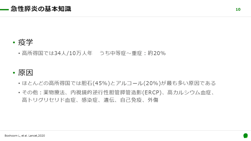 ほとんどの高所得国では胆石(45%)とアルコール(20%)が最も多い原因である
