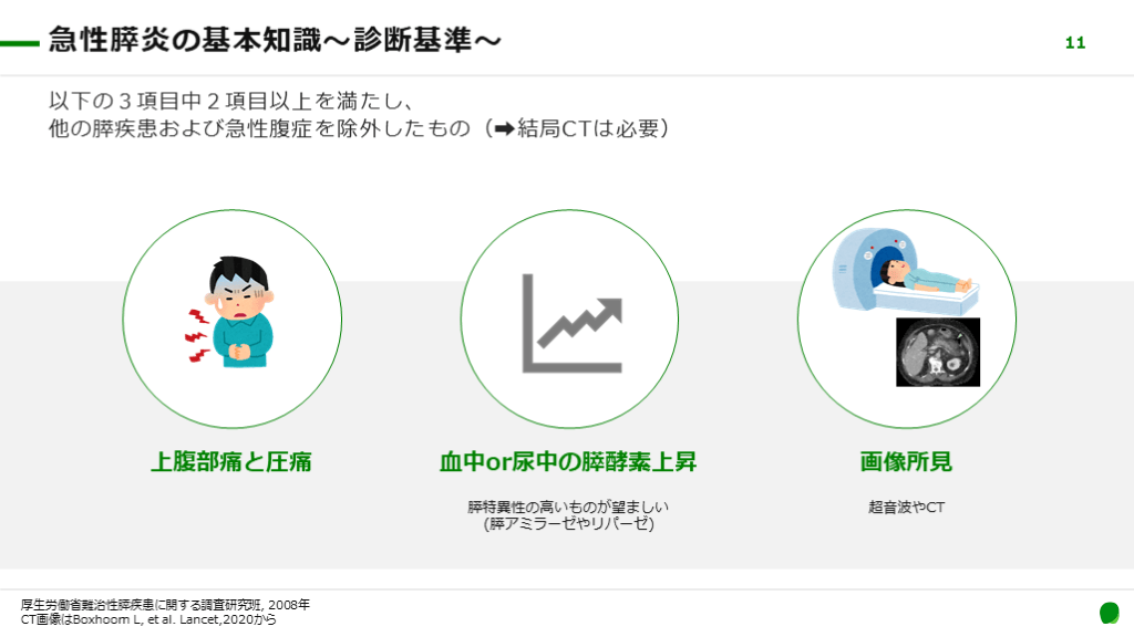 #11. 急性膵炎の基本知識〜診断基準〜 以下の3項目中2項目以上を満たし、他の膵疾患および急性腹症を除外したもの(➡️結局CTは必要) 11 厚生労働省難治性膵疾患に関する調査研究班, 2008年