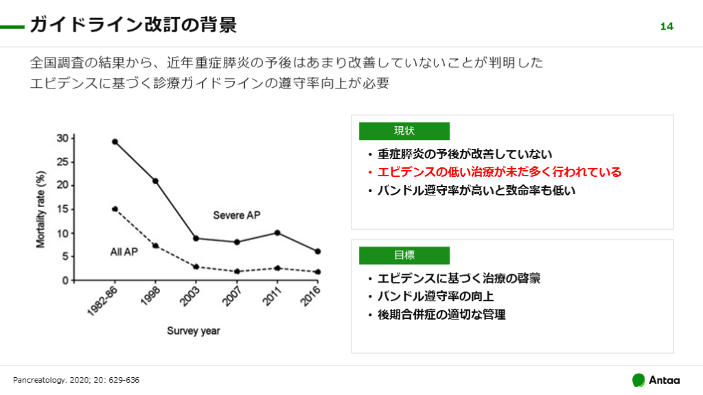 #14. 14 Pancreatology. 2020; 20: 629-636 ガイドライン改訂の背景 全国調査の結果から、近年重症膵炎の予後はあまり改善していないことが判明した